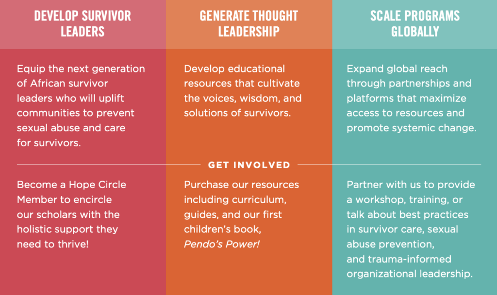 In the next two years, we want to move toward a vision that centers the leadership of African survivors of sexual violence. This process will develop communal understanding that practices equitable decision-making, financial sustainability, and power-building with survivor-leaders. We will achieve this through three key strategic priorities: